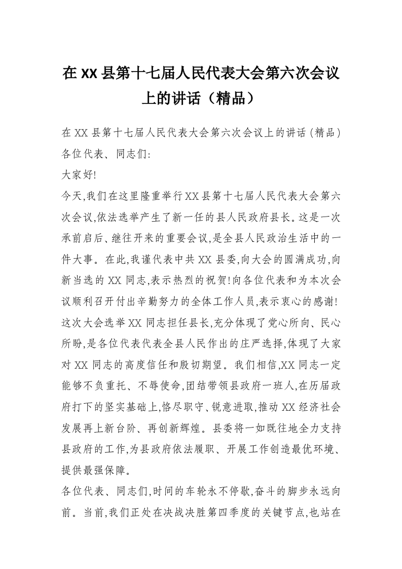 在XX县第十七届人民代表大会第六次会议上的讲话(精品)