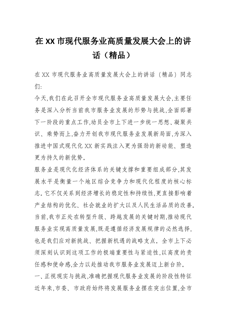 在XX市现代服务业高质量发展大会上的讲话(精品)