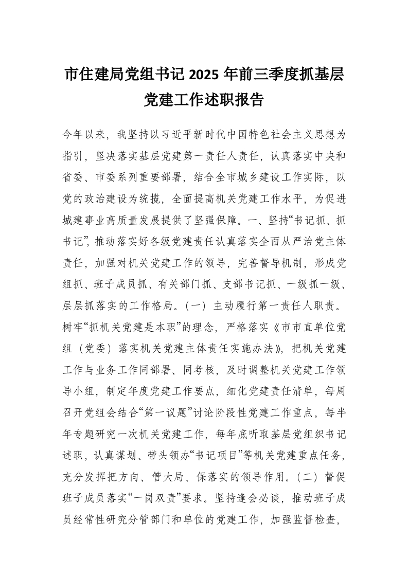 首页材料汇编市住建局党组书记2025年前三季度抓基层党建工作述职报告