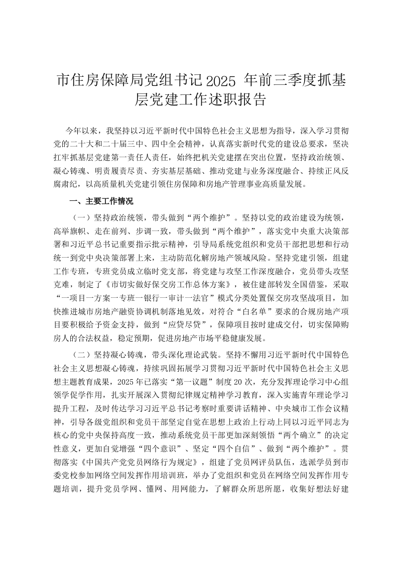 市住房保障局党组书记2025年前三季度抓基层党建工作述职报告