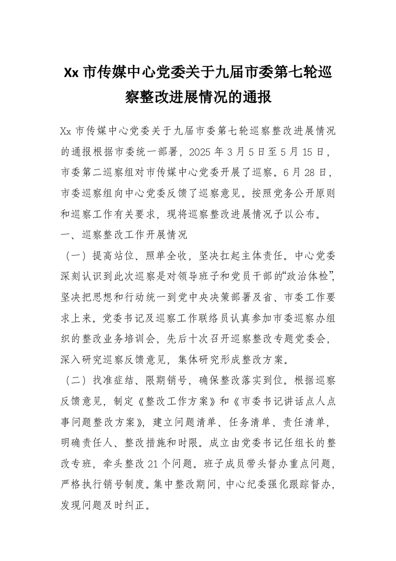 Xx市传媒中心党委关于九届市委第七轮巡察整改进展情况的通报