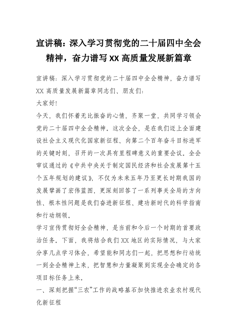 - 宣讲稿:深入学习贯彻党的二十届四中全会精神,奋力谱写XX高质量发展新篇章(精品)
