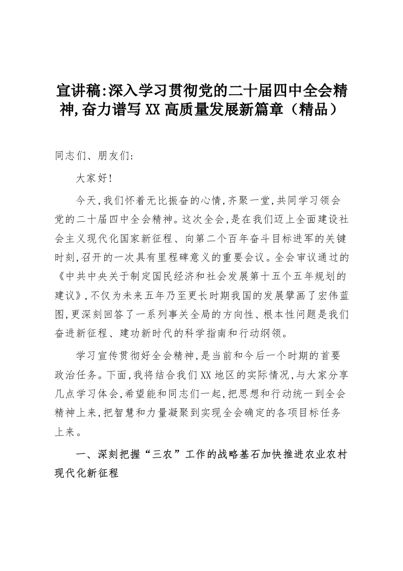 - 宣讲稿:深入学习贯彻党的二十届四中全会精神,奋力谱写XX高质量发展新篇章