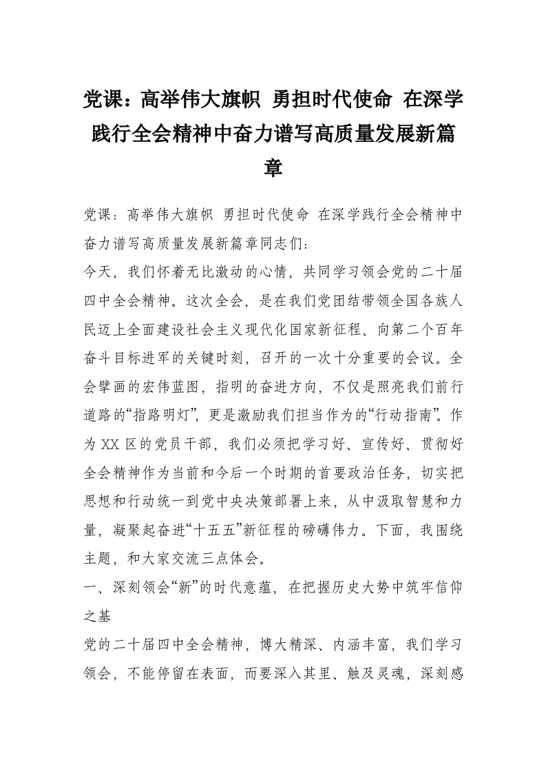 - 党课讲稿:高举伟大旗帜勇担时代使命 在深学践行全会精神中奋力谱写高质量发展新篇章