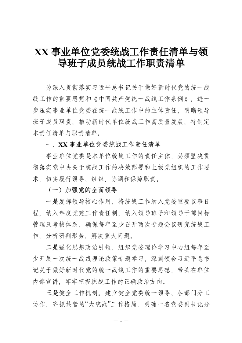 - XX事业单位党委统战工作责任清单与领导班子成员统战工作职责清单(精品)