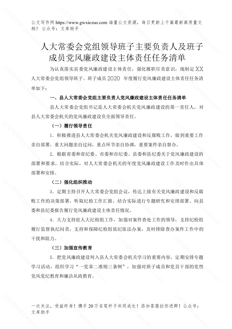 - X人大常委会党组领导班子党风廉政建设主体责任任务清单
