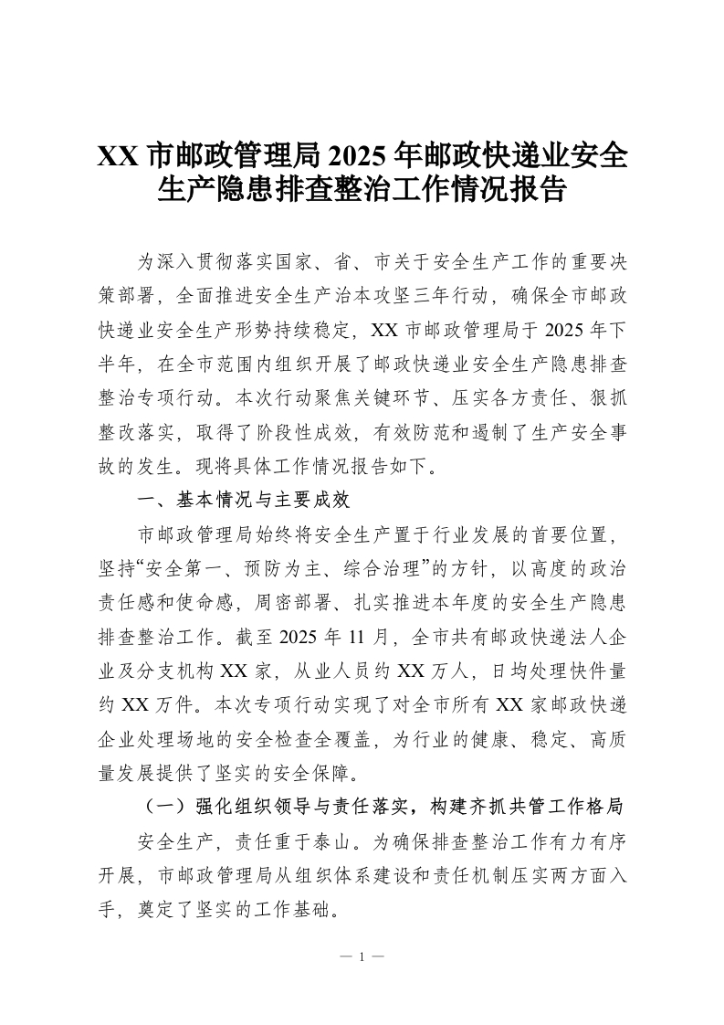 XX市邮政管理局2025年邮政快递业安全生产隐患排查整治工作情况报告