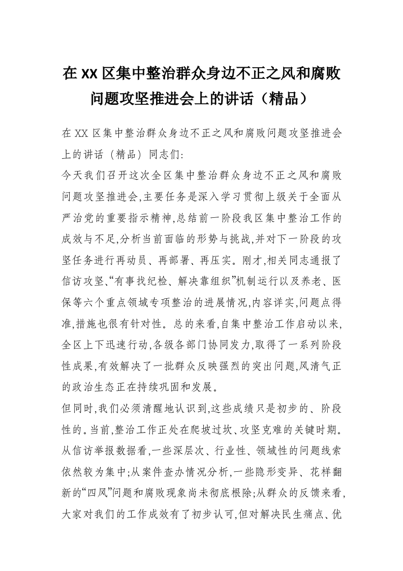 在XX区集中整治群众身边不正之风和腐败问题攻坚推进会上的讲话(精品)