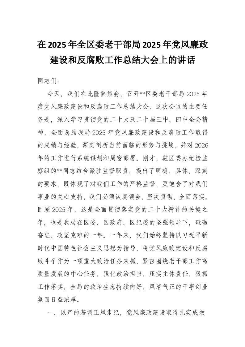 在2025年全区委老干部局2025年党风廉政建设和反腐败工作总结大会上的讲话