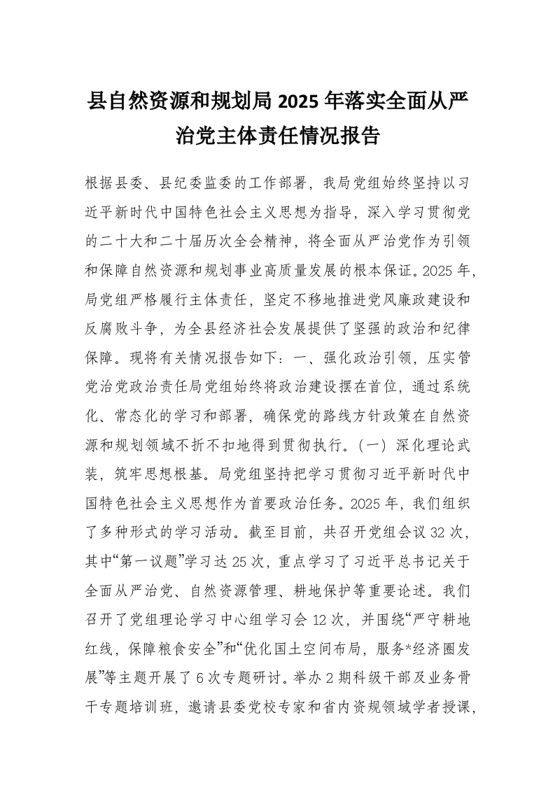 县自然资源和规划局2025年落实全面从严治党主体责任情况报告