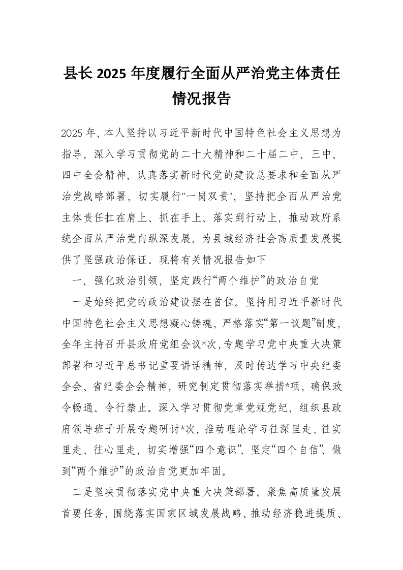 县长2025年度履行全面从严治党主体责任情况报告