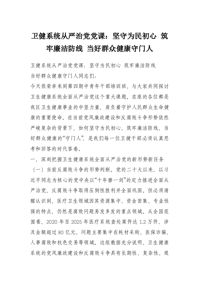 首页学习提升卫健系统从严治党党课:坚守为民初心 筑牢廉洁防线 当好群众健康守门人