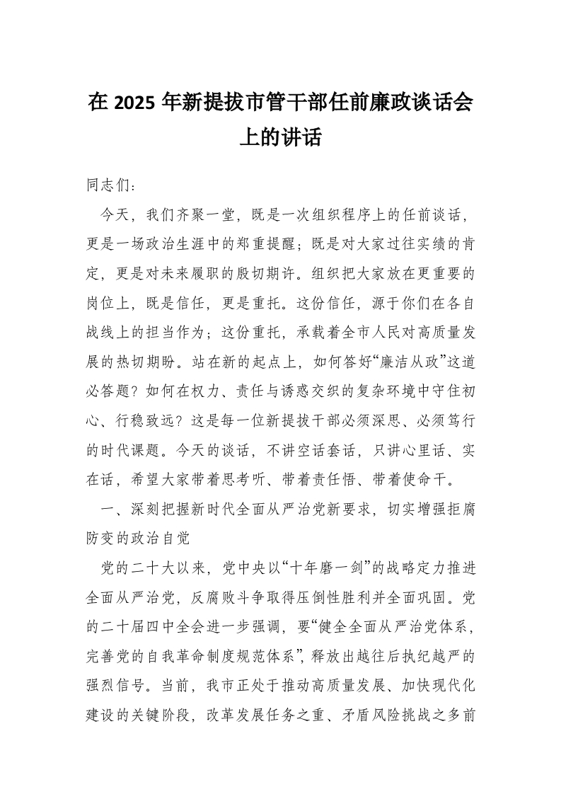 在2025年新提拔市管干部任前廉政谈话会上的讲话