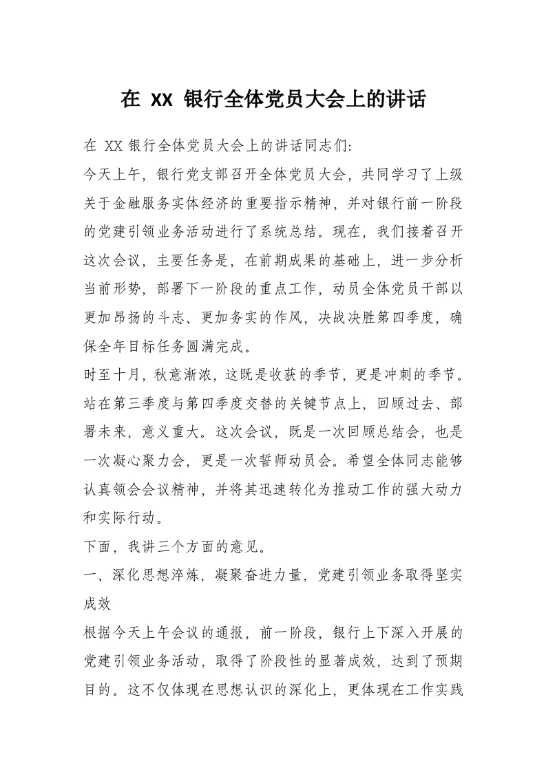 在 XX 银行全体党员大会上的讲话
