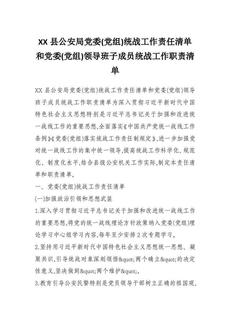 - XX县公安局委员会统战工作责任清单和领导班子成员统战工作职责清单(精品)