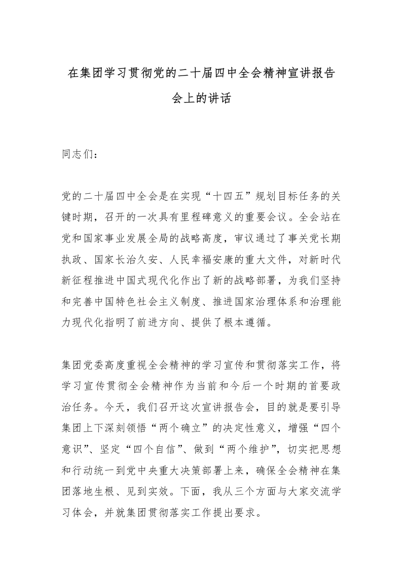 首页精选范文在集团学习贯彻党的二十届四中全会精神宣讲报告会上的讲话_副本