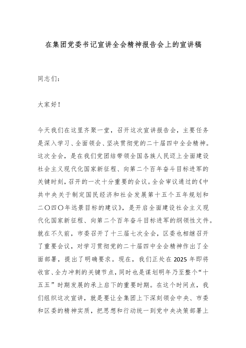 首页精选范文在集团党委书记宣讲全会精神报告会上的宣讲稿_副本