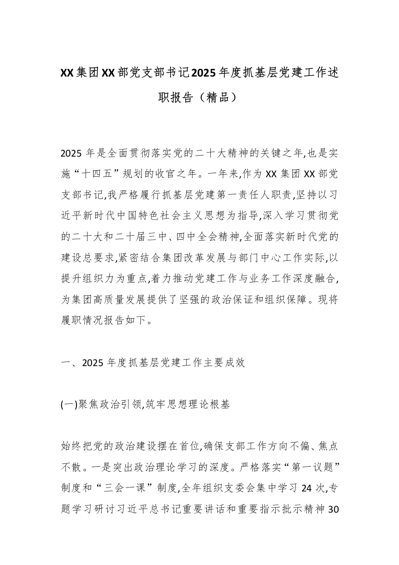 XX集团XX部党支部书记2025年度抓基层党建工作述职报告(精品)_副本