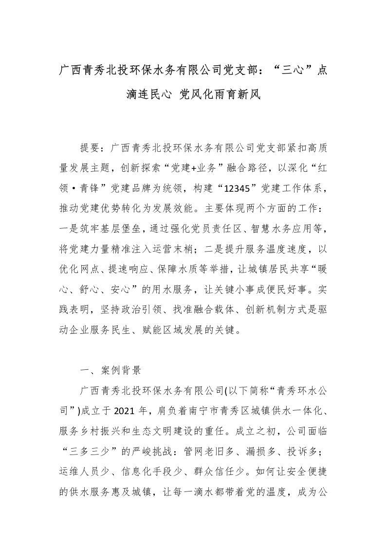 首页精选范文广西青秀北投环保水务有限公司党支部:“三心”点滴连民心 党风化雨育新风_副本