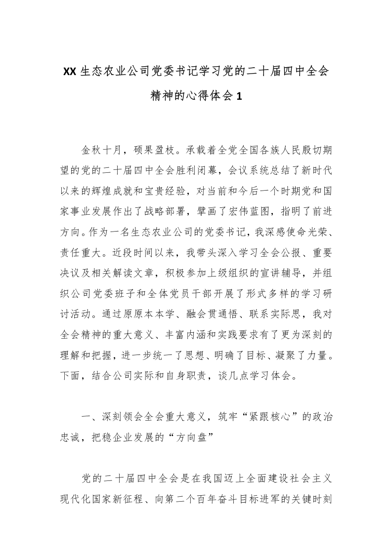 XX生态农业公司党委书记学习党的二十届四中全会精神的心得体会1_副本