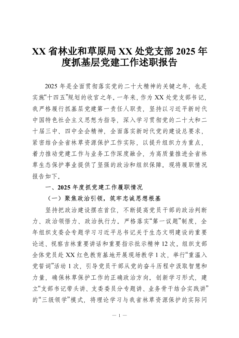 XX省林业和草原局XX处党支部2025年度抓基层党建工作述职报告