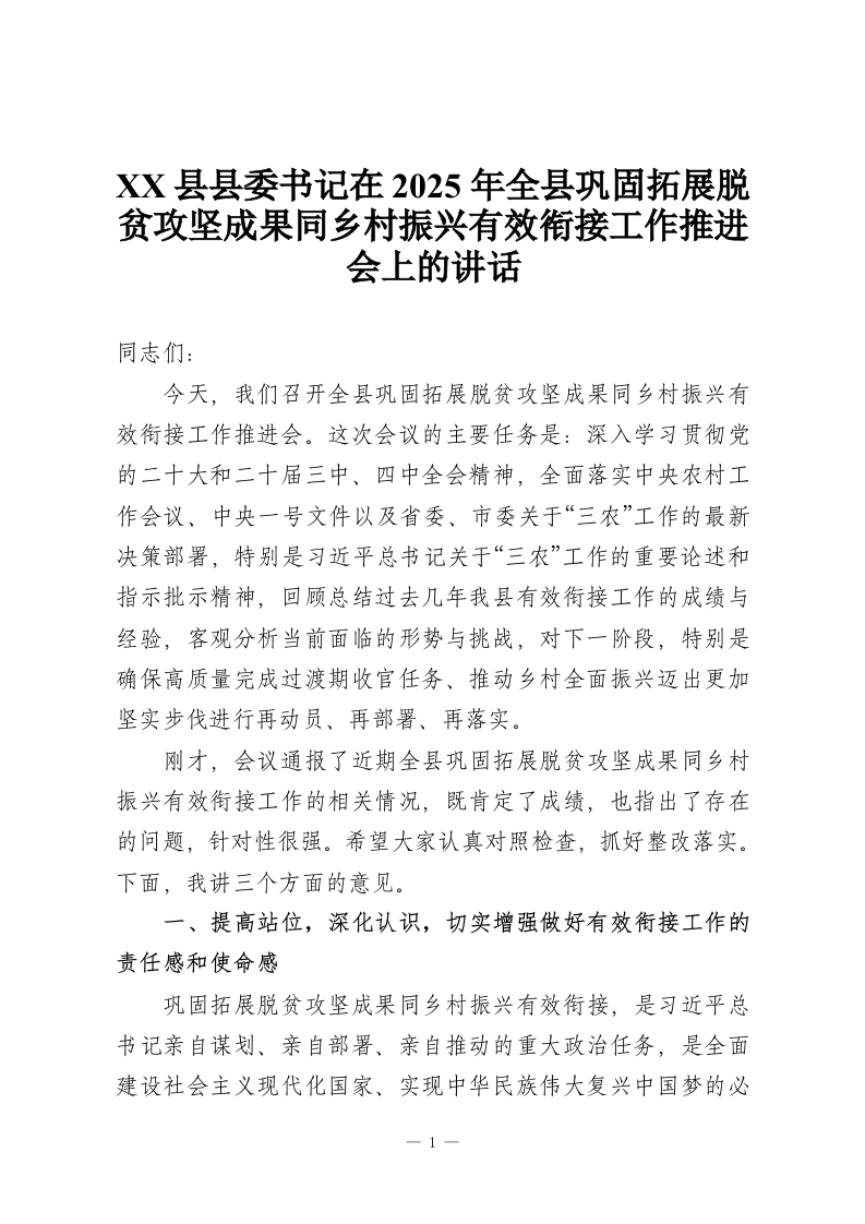 XX县县委书记在2025年全县巩固拓展脱贫攻坚成果同乡村振兴有效衔接工作推进会上的讲话