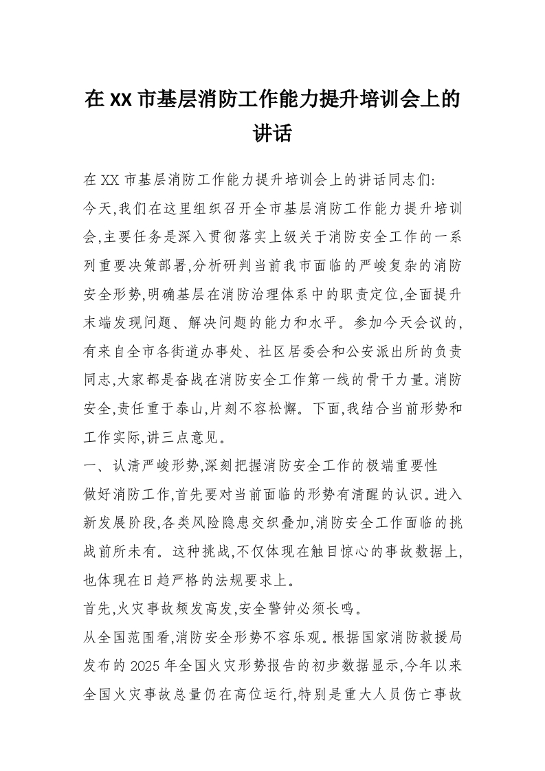 首页工作文档在XX市基层消防工作能力提升培训会上的讲话