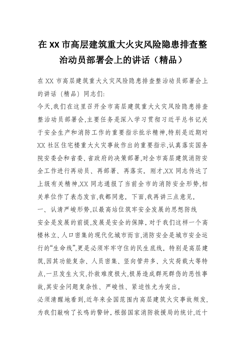 在XX市高层建筑重大火灾风险隐患排查整治动员部署会上的讲话(精品)