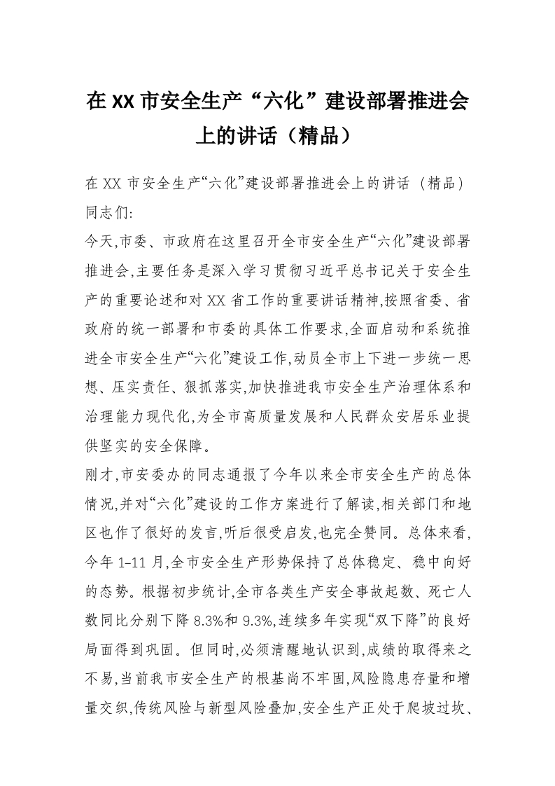 首页工作文档在XX市安全生产“六化”建设部署推进会上的讲话(精品)