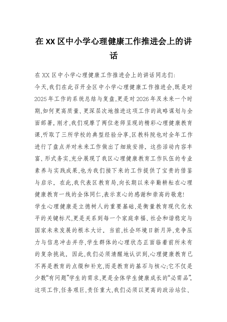 首页工作文档在XX区中小学心理健康工作推进会上的讲话