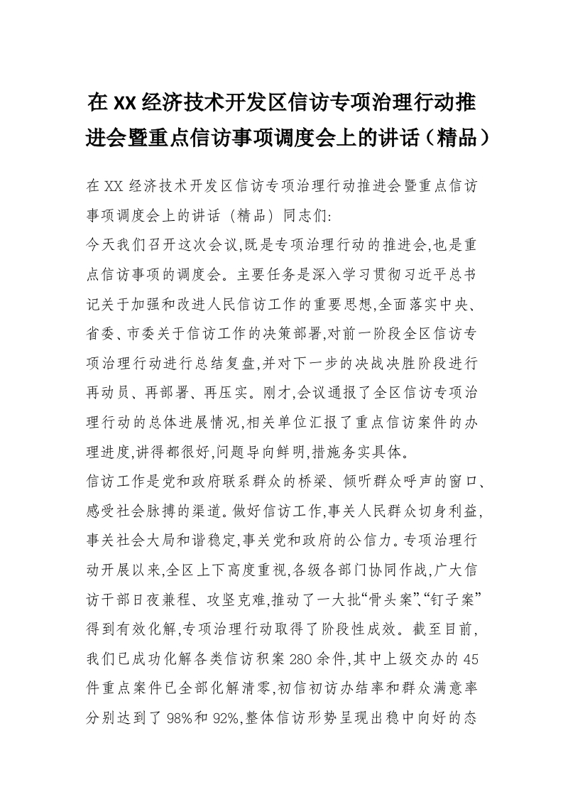 在XX经济技术开发区信访专项治理行动推进会暨重点信访事项调度会上的讲话(精品)