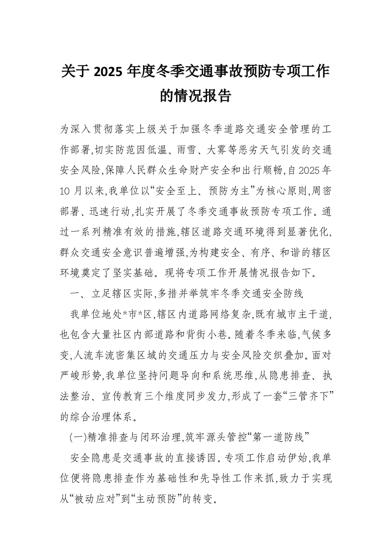 关于2025年度冬季交通事故预防专项工作的情况报告