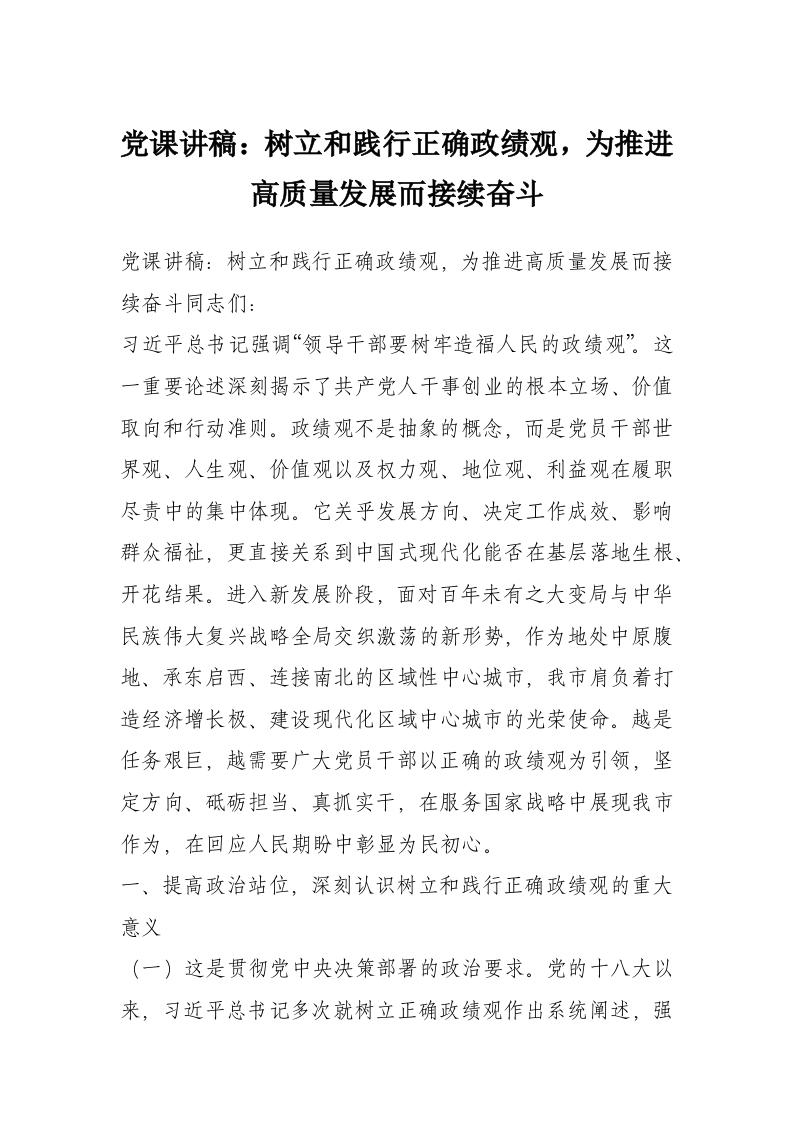 - 党课讲稿:树立和践行正确政绩观,为推进高质量发展而接续奋斗