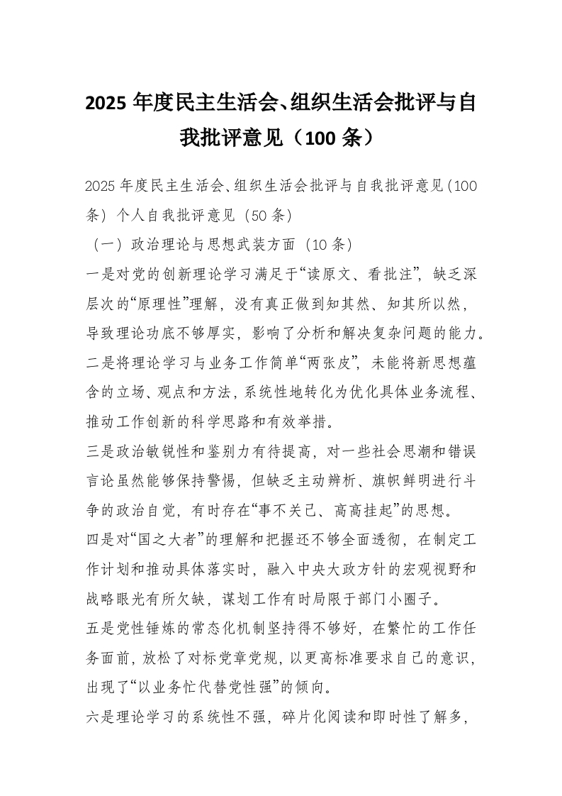 - 2025年度民主生活会、组织生活会批评与自我批评意见(100条)