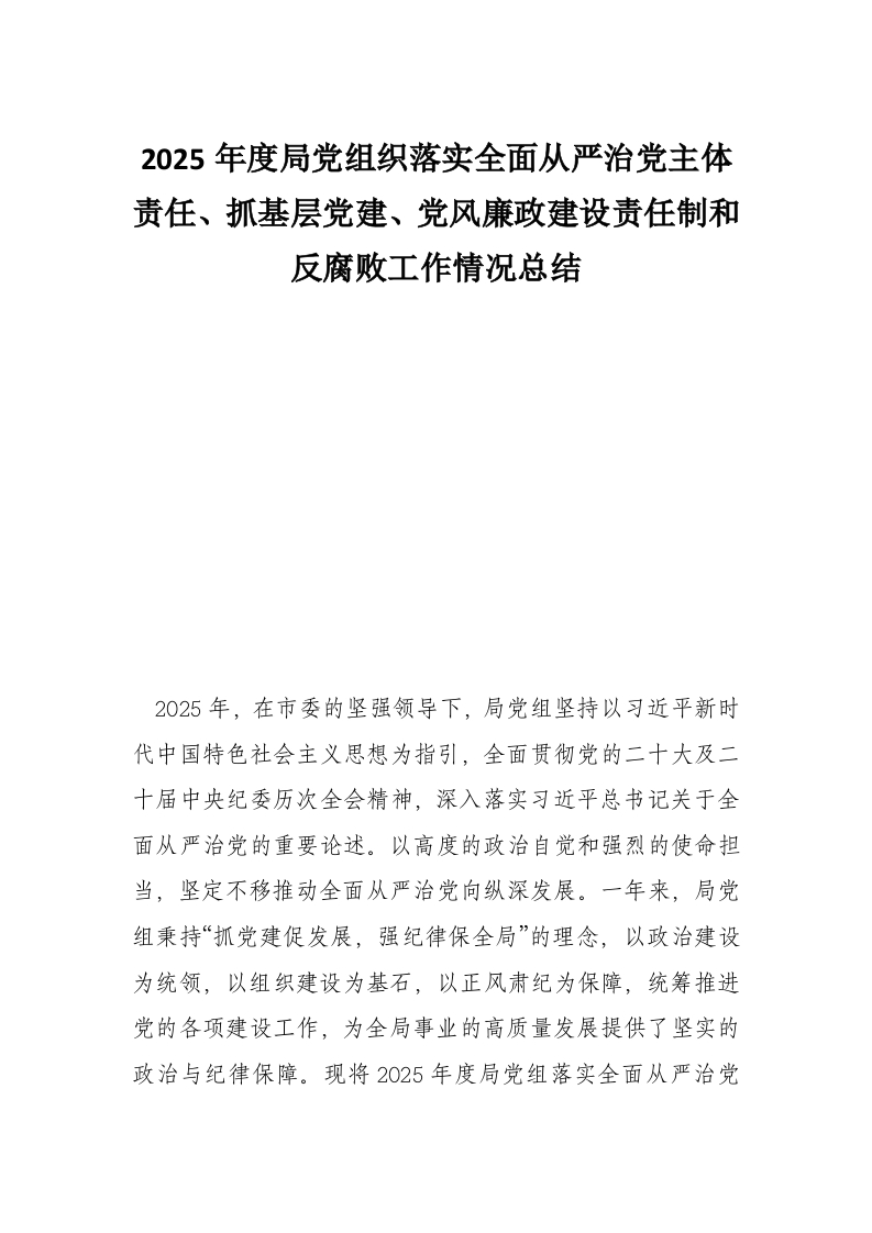 2025年度局党组织落实全面从严治党主体责任、抓基层党建、党风廉政建设责任制和反腐败工作情况总结