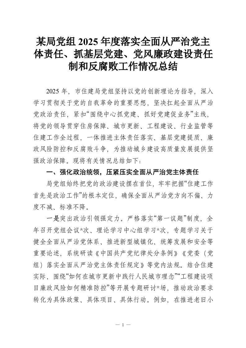 - 某局党组2025年度落实全面从严治党主体责任、抓基层党建、党风廉政建设责任制和反腐败工作情况总结