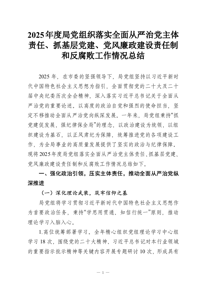 - 局党组2025年度落实全面从严治党主体责任、抓基层党建、党风廉政建设责任制和反腐败工作情况总结_1
