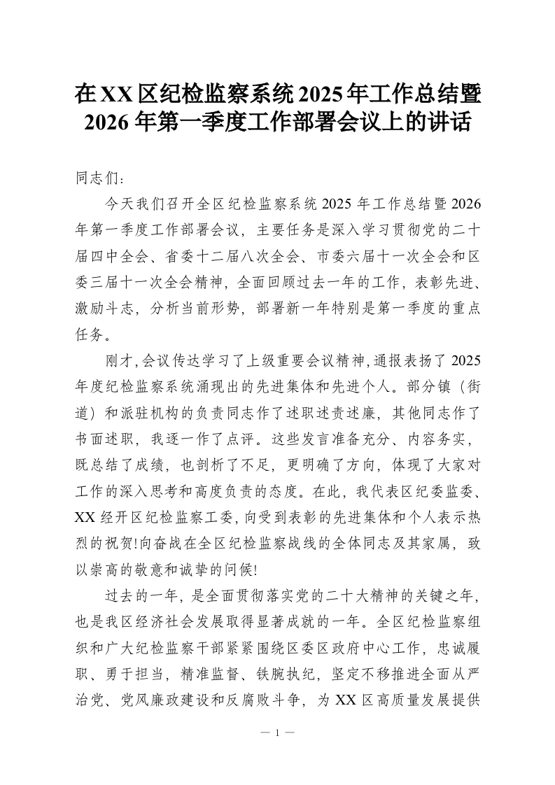 - 在XX区纪检监察系统2025年工作总结会议暨2026年第一季度工作部署会议上的讲话