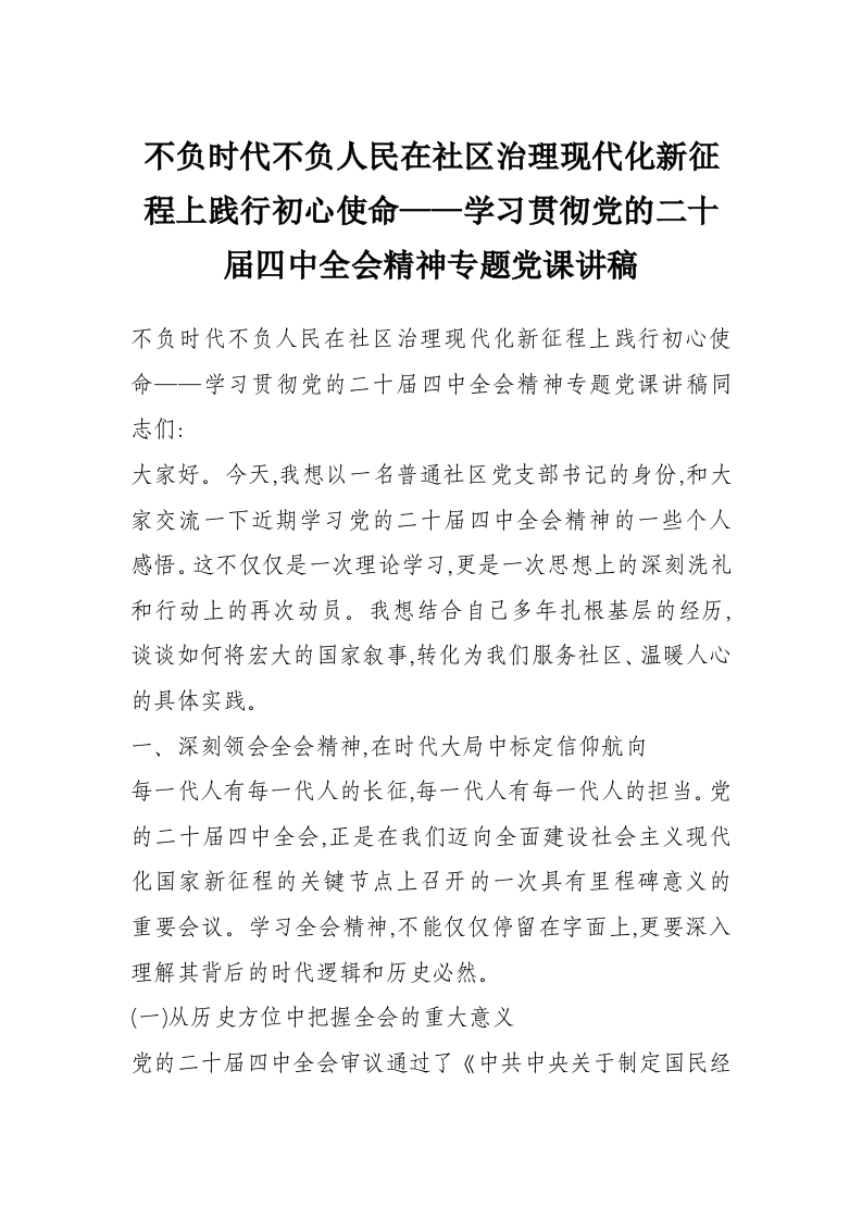 - 不负时代不负人民在社区治理现代化新征程上践行初心使命——学习贯彻党的二十届四中全会精神专题党课讲稿