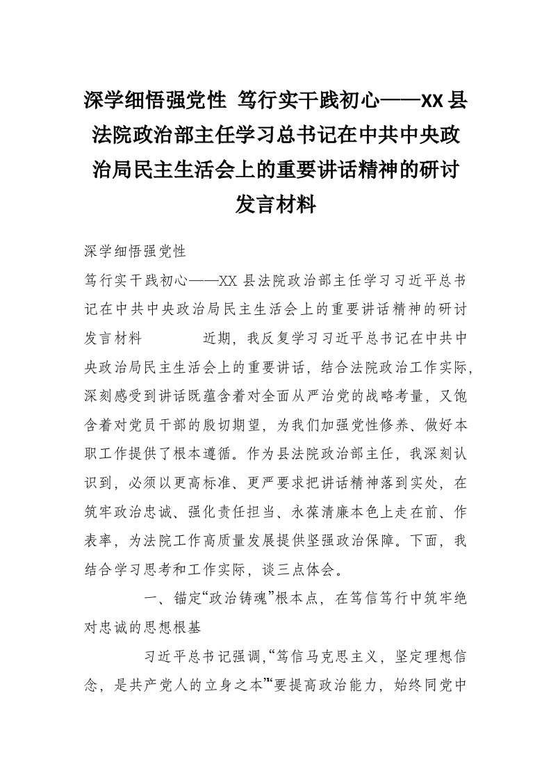 - 深学细悟强党性笃行实干践初心——XX县法院政治部主任学习***总书记在中共中央政治局民主生活会上的重要讲话精神的研讨发言材料
