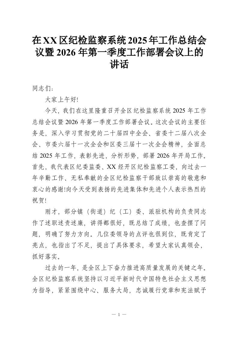 - 在XX区纪检监察系统2025年工作总结会议暨2026年第一季度工作部署会议上的讲话(精品)