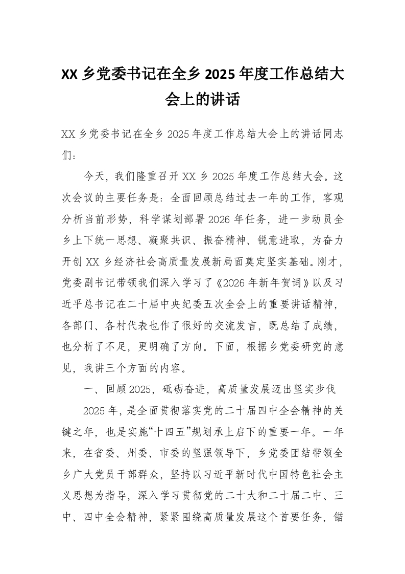- XX乡党委书记在全乡2025年度工作总结大会上的讲话2