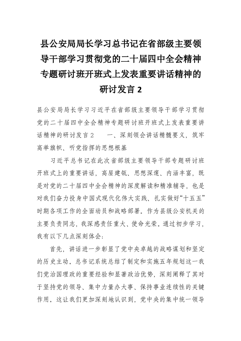 - 县公安局局长学习总书记在省部级主要领导干部学习贯彻党的二十届四中全会精神专题研讨班开班式上发表重要讲话精神的研讨发言