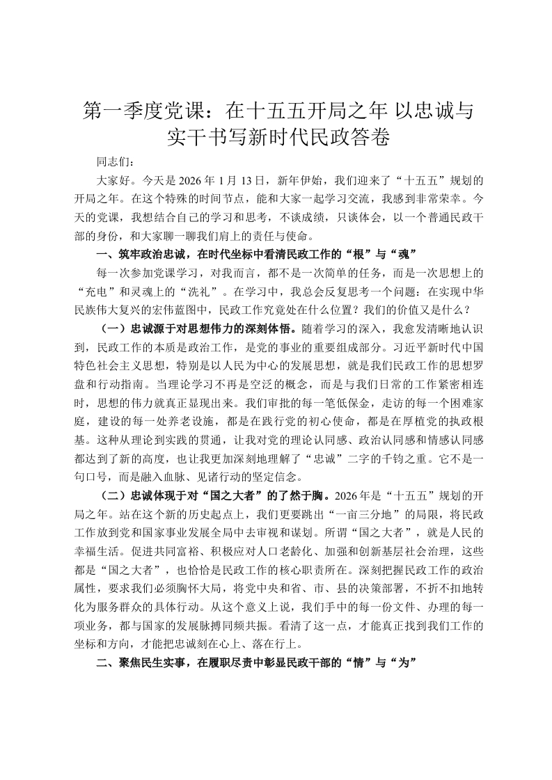- 在“十五五”开局之年,以忠诚与实干书写新时代民政答卷——在XX县XX局党支部2026年第一季度党课上的讲稿