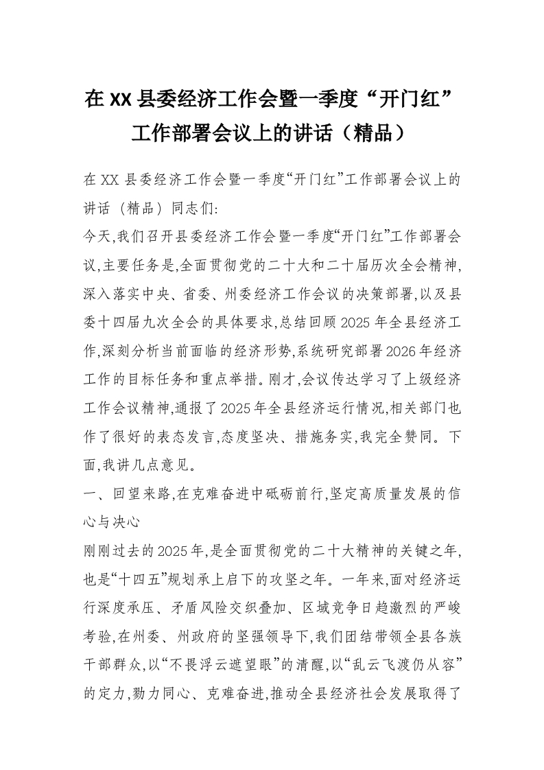 - 在XX县委经济工作会暨一季度“开门红”工作部署会议上的讲话