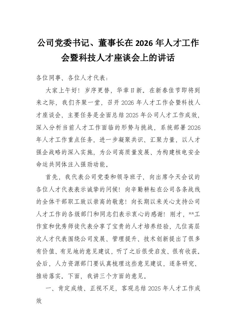 - XX公司党委书记、董事长在2026年人才工作会暨科技人才座谈会上的讲话2