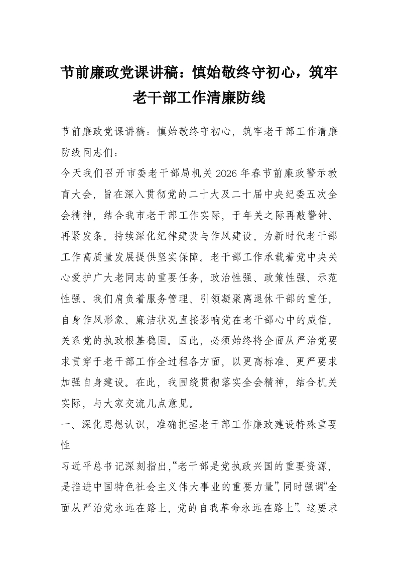 - 节前廉政党课:慎始敬终守初心,筑牢老干部工作清廉防线