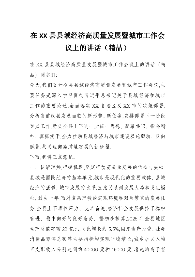 - 在XX县县域经济高质量发展暨城市工作会议上的讲话