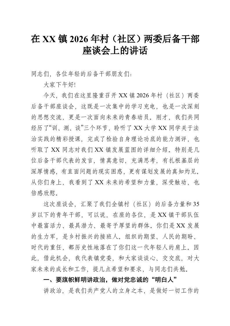 - 在XX镇2026年村(社区)两委后备干部座谈会上的讲话(精品)