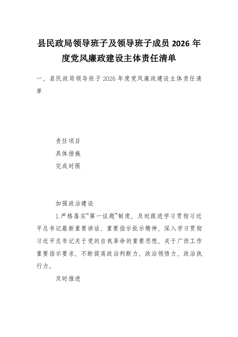 - Xx县民政局领导班子、主要负责人及领导班子其他成员2025年度党风廉政建设主体责任清单